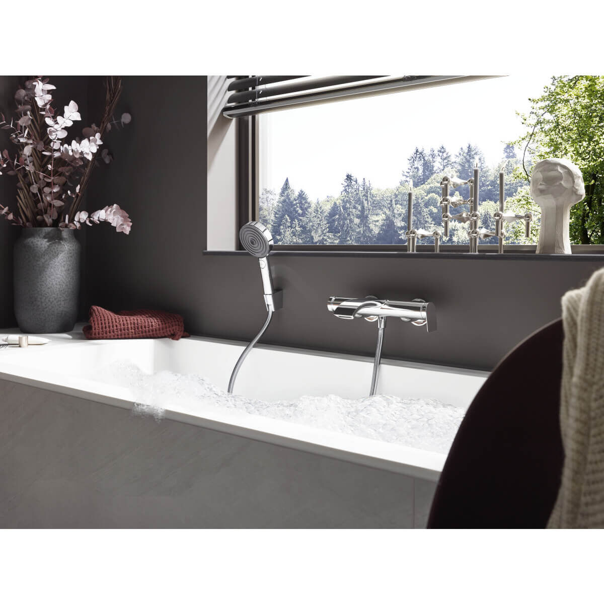Die Hansgrohe Vivenis Einhebel-Wannenarmatur bringt mit ihrer harmonischen Form und der eleganten Ästhetik neues Leben an die Wanne. Der mit Luft angereicherte, volle Wasserstrahl fließt wie ein kleiner Wasserfall aus dem sanft geschwungenen Auslauf (WaterfallStream), was bereits beim Befüllen der Wanne für ein besonderes Erlebnis sorgt. Die Armatur ist zur Aufputz-Installation konzipiert und eignet sich perfekt für die einfache Renovierung: Sie lässt sich mühelos auf vorhandene Standard-S-Anschlüsse montieren (Größe G ½, DN15).