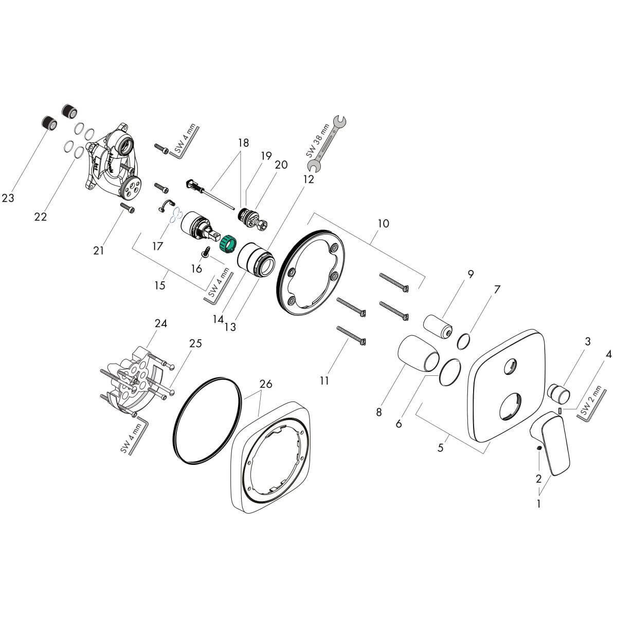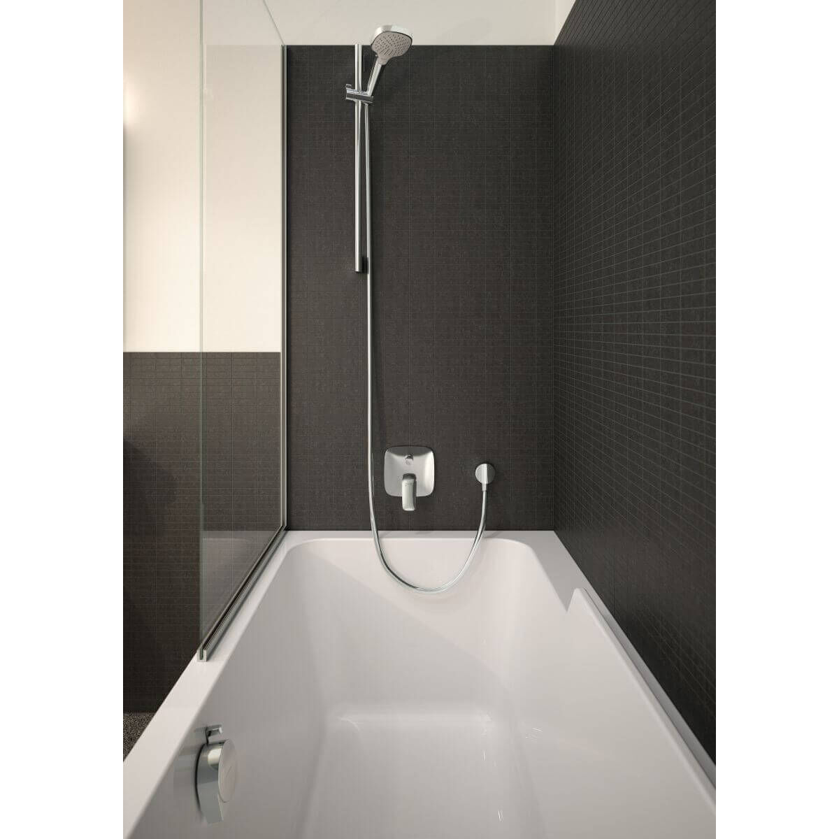 Die Armatur wird als Unterputzlösung installiert, wodurch nur die edle Bedienfront sichtbar bleibt – für ein aufgeräumtes Erscheinungsbild im Bad. Der Anschluss erfolgt über den passenden Hansgrohe Grundkörper, der separat erhältlich ist.