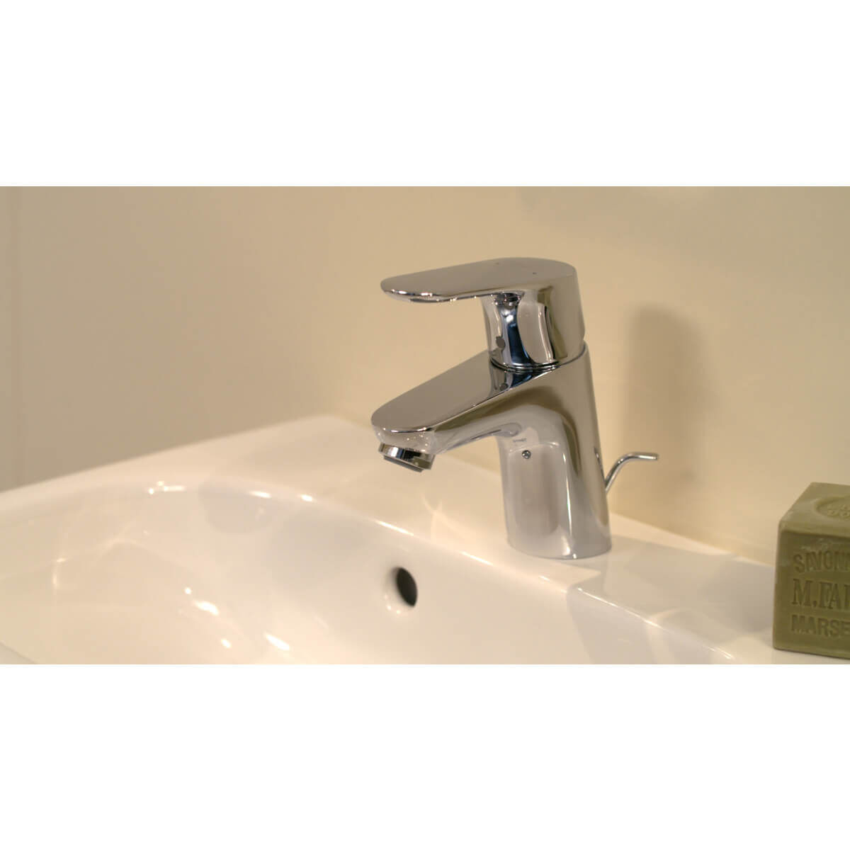 Der ergonomisch geformte, flächige Griff ermöglicht eine präzise Steuerung der Wassermenge und -temperatur. Ein langlebiges Keramikmischsystem im Inneren der Armatur sorgt für dauerhafte Funktionssicherheit. Die mitgelieferte Zugstangen-Ablaufgarnitur lässt sich einfach mit einer Hand bedienen, was zusätzlichen Komfort bietet.