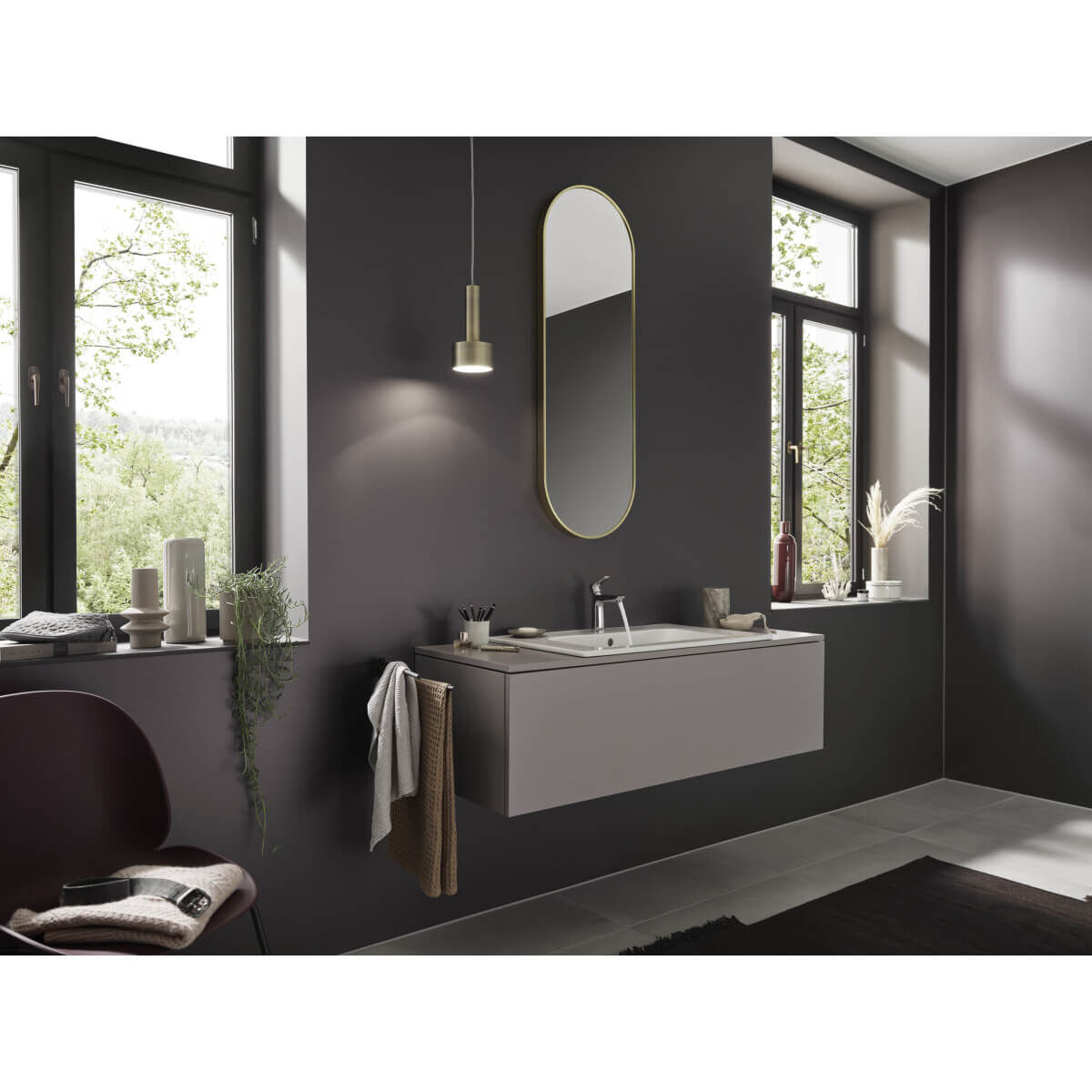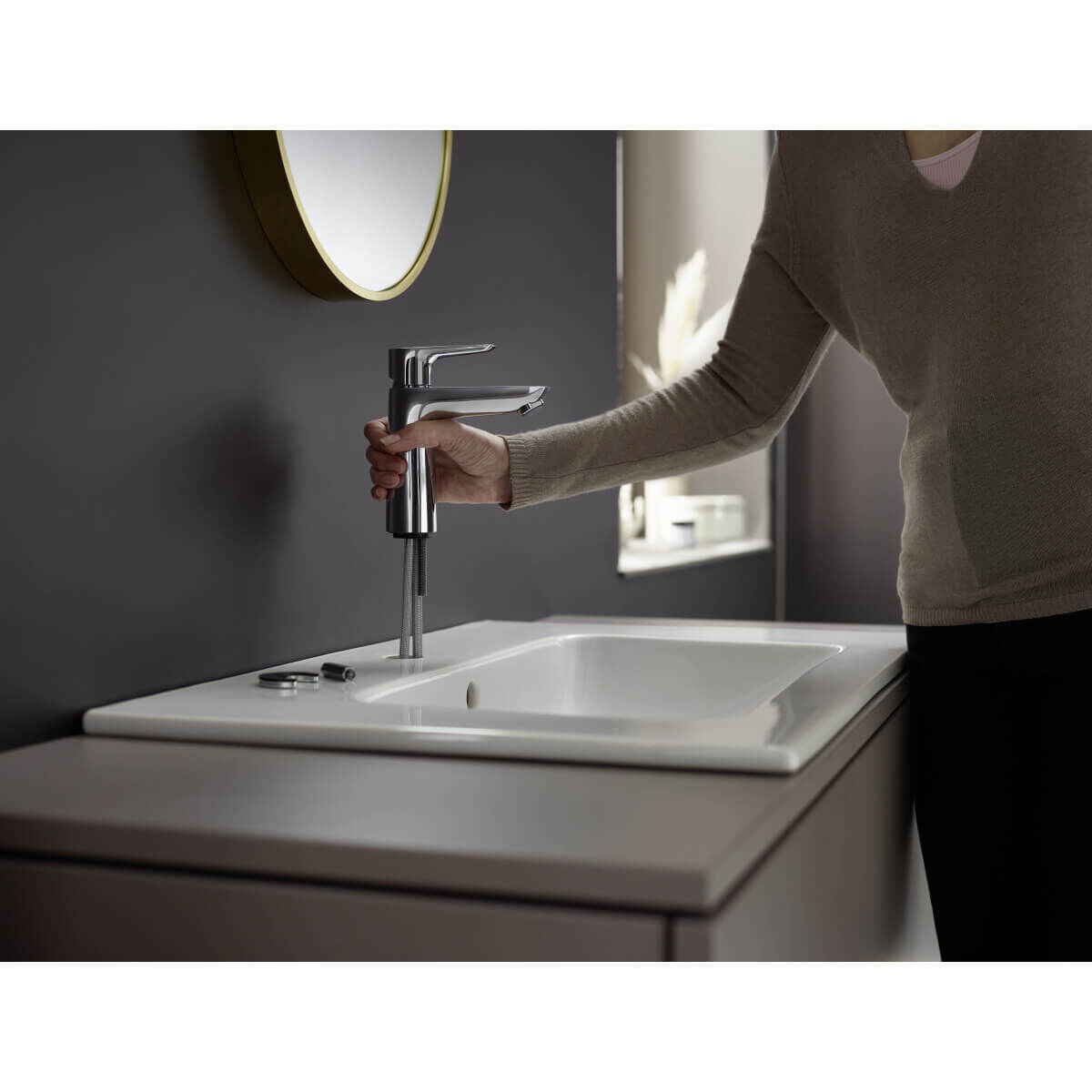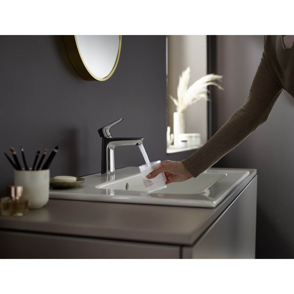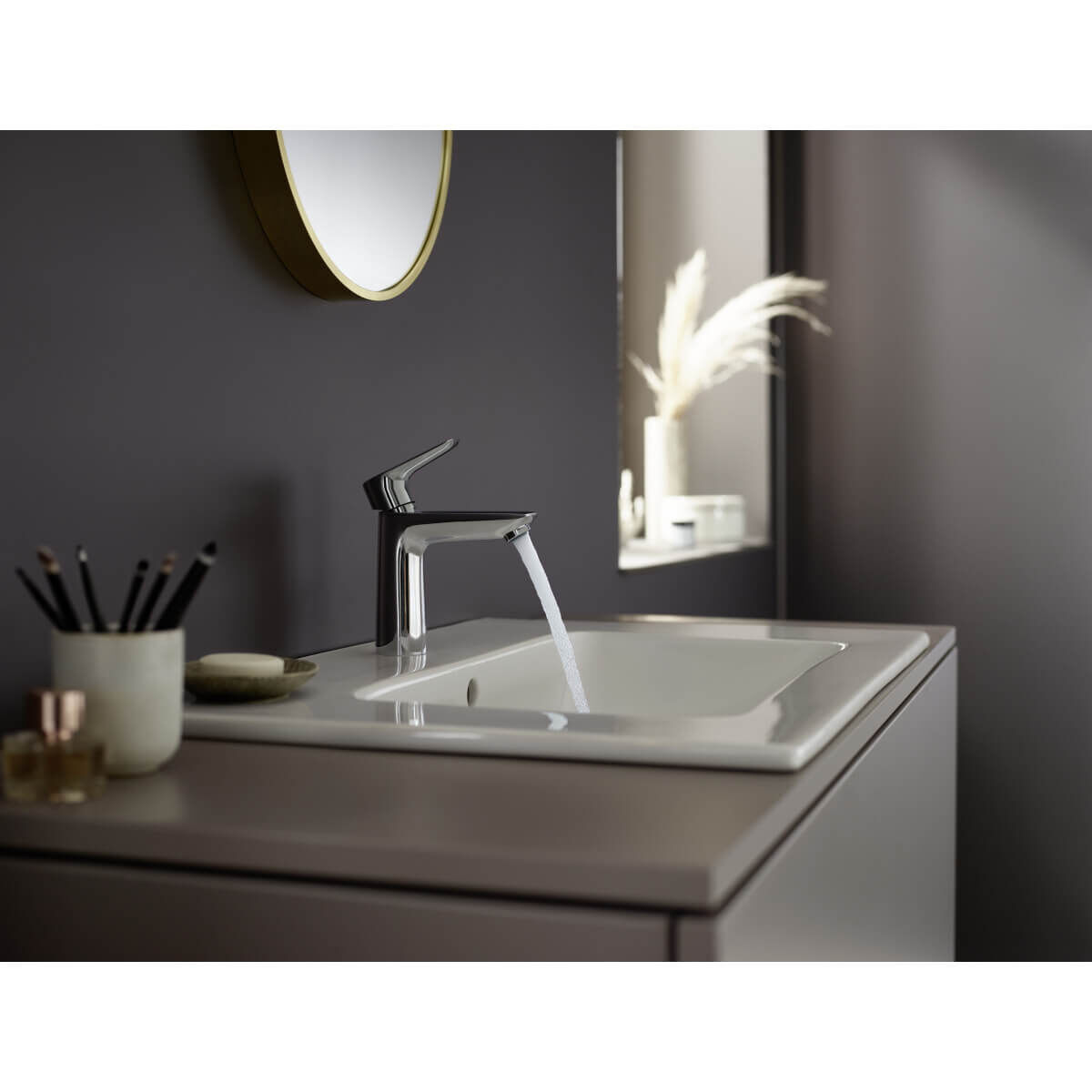 Der ergonomische Einhebelmischer ist leichtgängig und dank des langlebigen Keramikmischsystems von Hansgrohe besonders robust. Die Push-Open Ablaufgarnitur lässt sich mühelos bedienen und sorgt für ein harmonisches Gesamtbild ohne störende Elemente an der Armaturrückseite. Die AirPower-Technologie reichert das Wasser mit Luft an, was für einen weichen, vollen Wasserstrahl sorgt, der weniger spritzt.